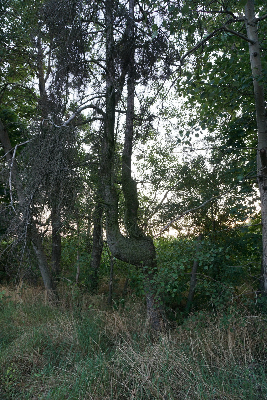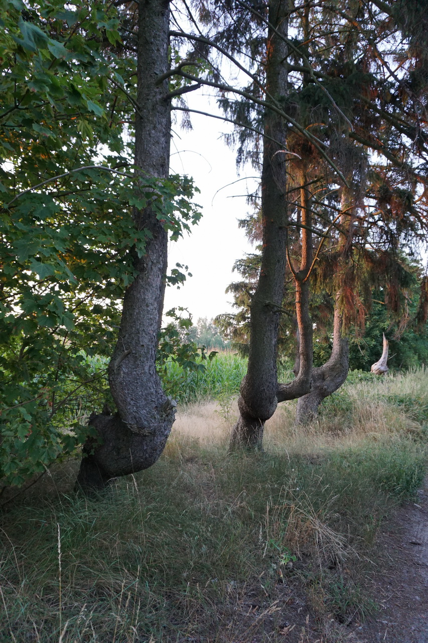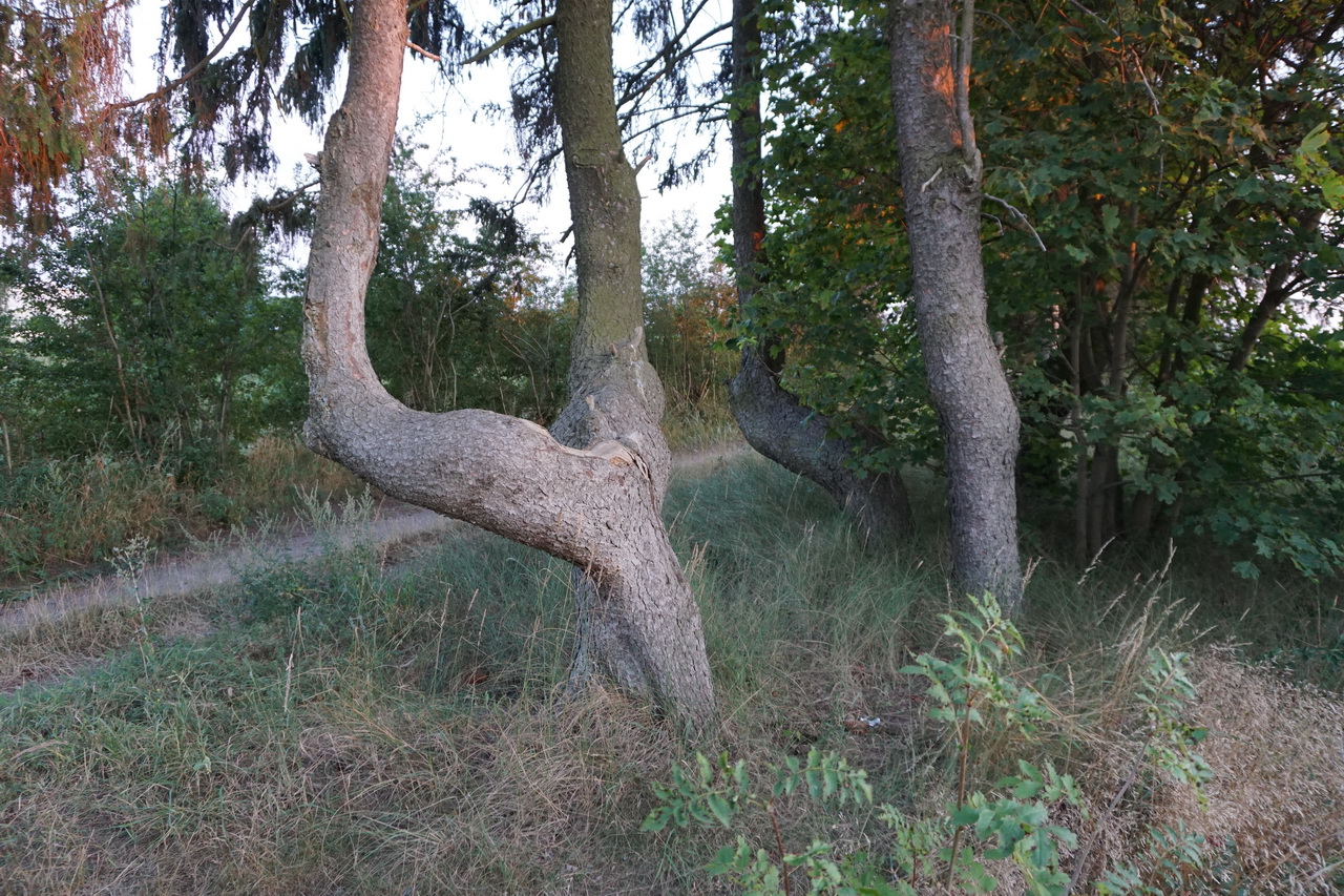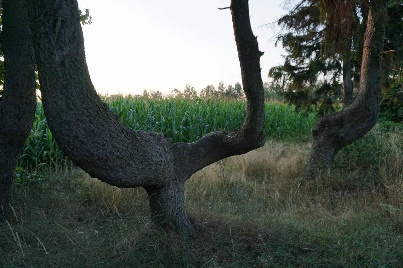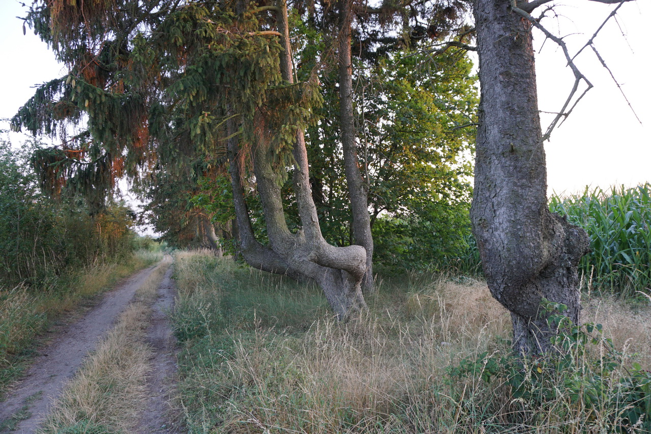 Nie wiem, czy macie podobne odczucia, ale mi ich forma natychmiast skojarzyła się z tym, co można zobaczyć w Krzywym Lesie koło Gryfina. Miejsce to, z powodu występowania na jego terenie około stu charakterystycznie zdeformowanych sosen zwyczajnych, ma status pomnika przyrody i od pewnego czasu jest popularną atrakcją turystyczną. Pnie krzywoleskich drzew są wygięte pod kątem dziewięćdziesięciu stopni, a krzywizna sięga wysokości kilku metrów. Powstało wiele różnych teorii, dlaczego te sosny wyglądają tak, a nie inaczej, jednak przeprowadzone przeze mnie oględziny złotowskich świerków dowodzą, że przyczyna tego rodzaju deformacji może być prozaiczna. Ktoś po prostu ściął główny pień, oszczędzając boczne gałęzie, a te z upływem lat konsekwentnie pięły się w górę, by ostatecznie go zastąpić.