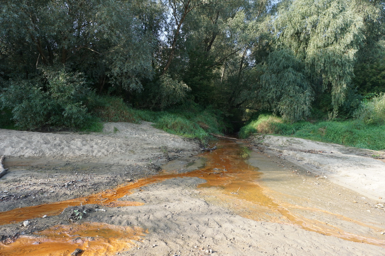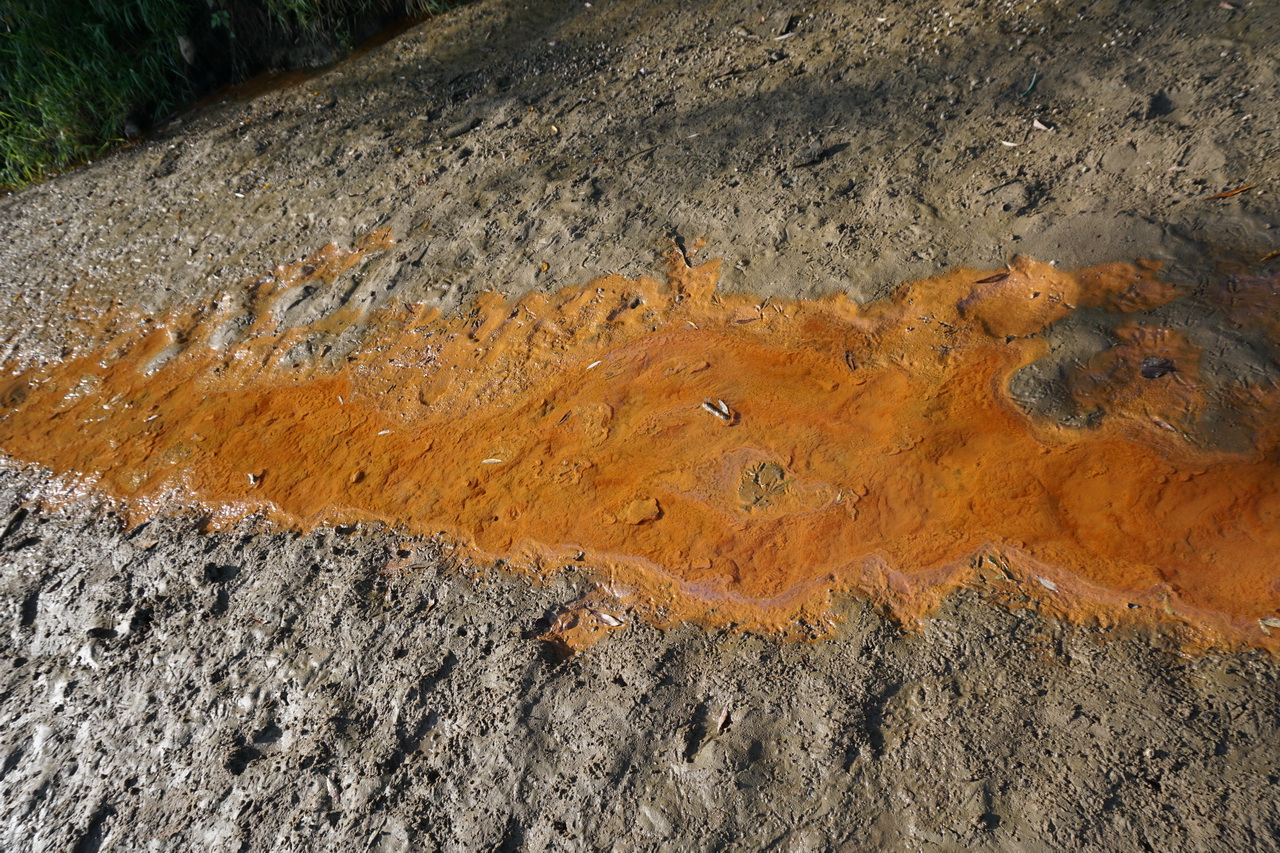 Na fotografiach powyżej możecie zobaczyć ujście kanałku w sąsiedztwie Wybrzeża Gdyńskiego. Podczas pracy pogłębiarki, spływa nim woda z zakładu PIASKARZ S.A., zassana uprzednio wraz z piaskiem z dna rzeki. W dniu wykonania zdjęć zamiast strumyka zastałem tam nieregularną, pomarańczową kałużę. To, co możecie zobaczyć na zdjęciach jest efektem działania bakterii, które czerpią energię do życia z procesu utleniania rozpuszczonych w wodzie jonów żelaza (rzadziej manganu). Nie wiem, jaki dokładnie szczep drobnoustrojów doprowadził do uwiecznionej przeze mnie przemiany, jednak nie zmienia to faktu, że jej widoczne efekty są intrygujące…
