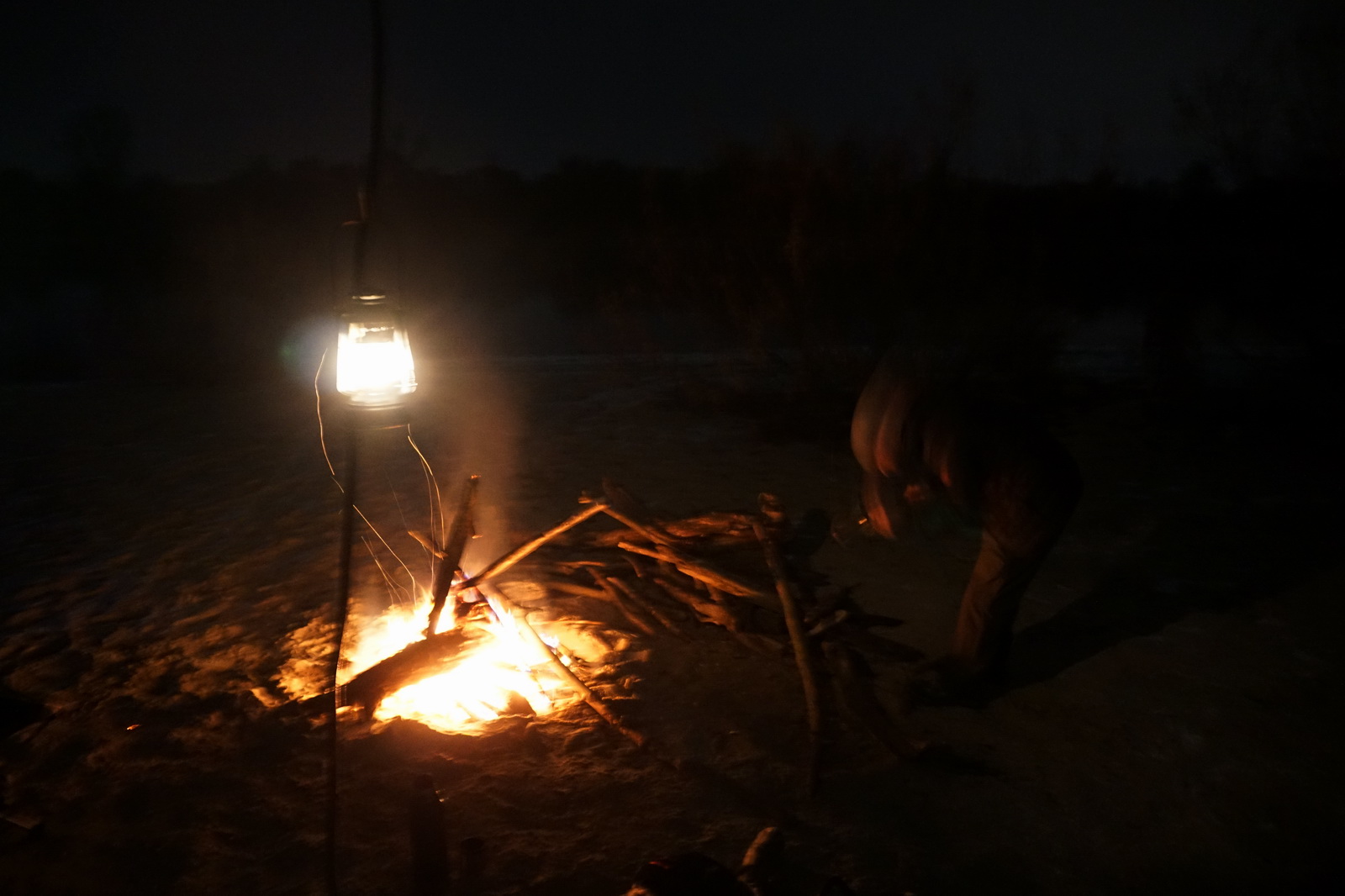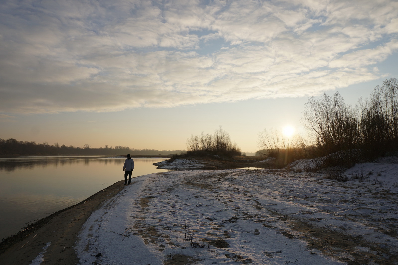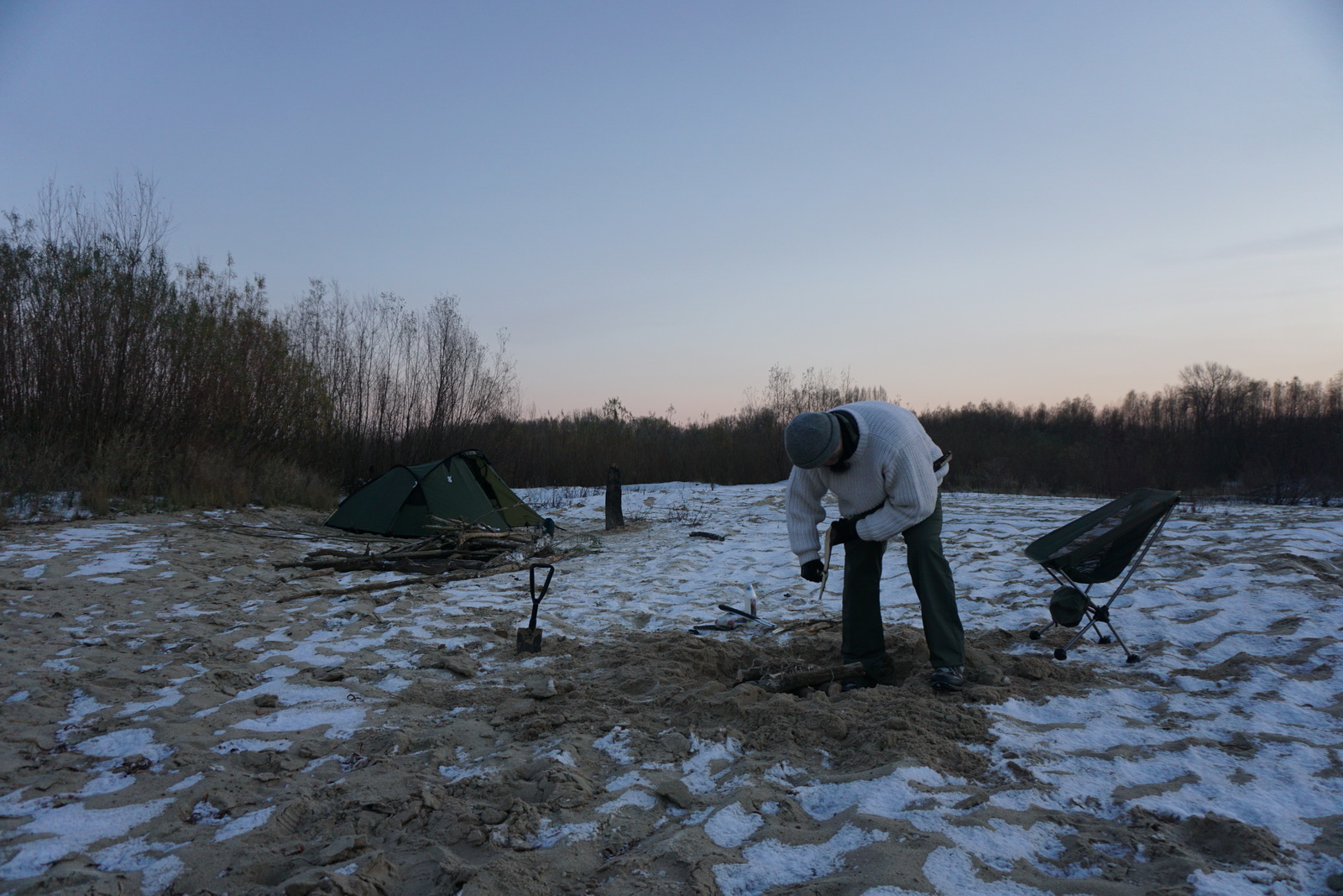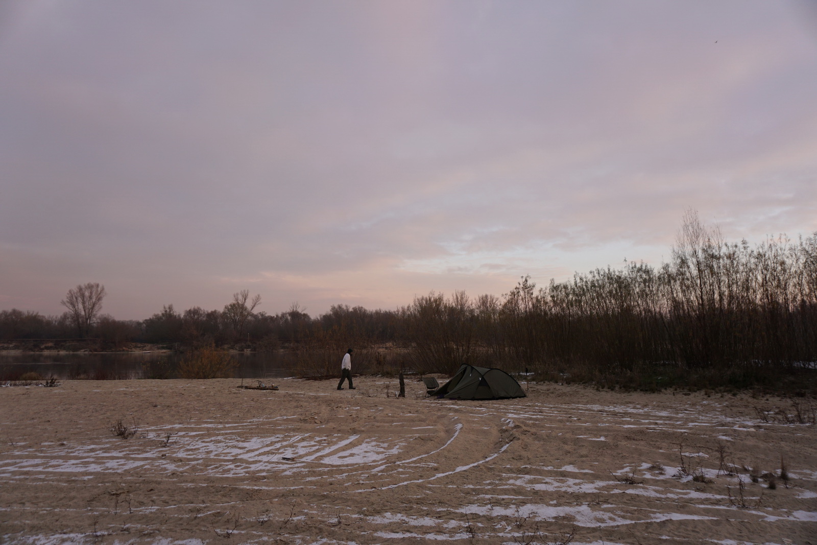 Kilka tygodni temu ustaliliśmy z Marcinem, iż mamy do obgadania kilka tematów i że w zasadzie można by to połączyć z jakimś noclegiem w terenie. Termin naszego biwaku zbiegł się w czasie z nagłym ochłodzeniem, ale ujemna temperatura nie była w stanie ostudzić naszych rozgorączkowanych głów. Kiedy przyczłapaliśmy nad Wisłę objuczeni garbami plecaków, nasze cienie były już długie, a nisko zawieszone słońce krasiło światłem jej przeciwległy brzeg. Nad ospale płynącą wodą od czasu do czasu przewalały się stada mew, zaś w tle chropawo nawoływały się kruki. Szybko ubywało dnia, więc niezwłocznie zabraliśmy się za rozbijanie namiotu i szykowanie ogniska. Nadrzeczne połacie piasku nocą oprószył śnieg. Wbijając śledzie w zmrożone podłoże, Marcin żartował, że to najlepszy moment na biwakowanie, ponieważ z pewnością nie będzie komarów 🙂 Ogień zapłonął na dobre prawie w tej samej chwili, kiedy na niebie dostrzegliśmy Jowisza. Podczas, gdy mój druh bawił się w „ogniskowego”, ja włóczyłem się po okolicy rozświetlając mrok lampą naftową. Potem, wlewając w siebie kolejne kubki kawy, ćwiczyliśmy się w sztuce „nicnierobienia”. Niedługo przed północą – zziębnięci i solidnie przywędzeni dymem – wbiliśmy się w śpiwory. Stłumione głosy przelatujących gęsi przypomniały mi naszą wyprawę na Svalbard (2017 rok), gdzie także dostawaliśmy w skórę na własne życzenie. Tam jednak było jasno przez całą dobę i trzeba było wypatrywać białych niedźwiedzi, mając u boku hitlerowski karabin. Teraz, starając się zasnąć, wsłuchiwałem się w odgłosy nocy. Moja Rzeka była tuż obok – zimna, spokojna i dzika, a generał mróz, nie pytając nikogo o zgodę, brał we władanie piaszczysty świat…