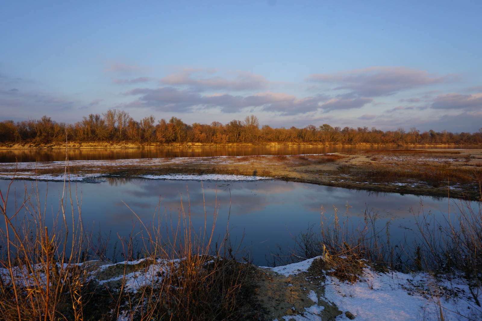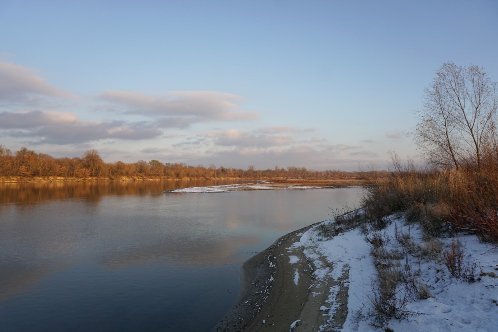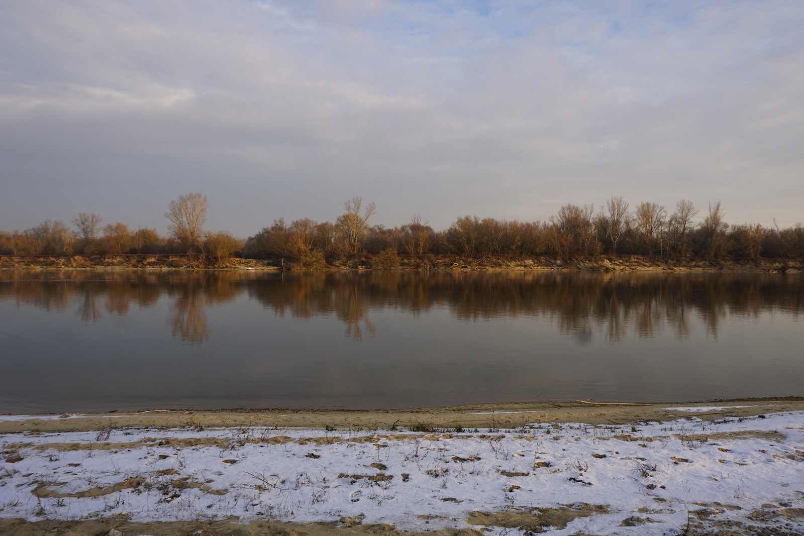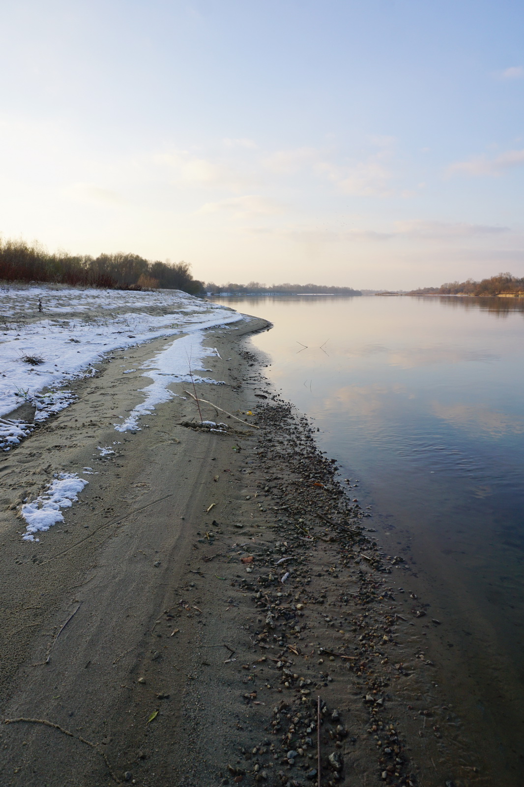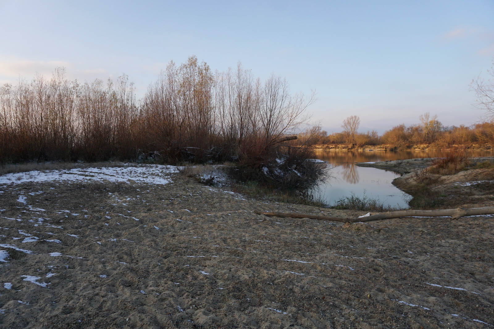 Kilka tygodni temu ustaliliśmy z Marcinem, iż mamy do obgadania kilka tematów i że w zasadzie można by to połączyć z jakimś noclegiem w terenie. Termin naszego biwaku zbiegł się w czasie z nagłym ochłodzeniem, ale ujemna temperatura nie była w stanie ostudzić naszych rozgorączkowanych głów. Kiedy przyczłapaliśmy nad Wisłę objuczeni garbami plecaków, nasze cienie były już długie, a nisko zawieszone słońce krasiło światłem jej przeciwległy brzeg. Nad ospale płynącą wodą od czasu do czasu przewalały się stada mew, zaś w tle chropawo nawoływały się kruki. Szybko ubywało dnia, więc niezwłocznie zabraliśmy się za rozbijanie namiotu i szykowanie ogniska. Nadrzeczne połacie piasku nocą oprószył śnieg. Wbijając śledzie w zmrożone podłoże, Marcin żartował, że to najlepszy moment na biwakowanie, ponieważ z pewnością nie będzie komarów 🙂 Ogień zapłonął na dobre prawie w tej samej chwili, kiedy na niebie dostrzegliśmy Jowisza. Podczas, gdy mój druh bawił się w „ogniskowego”, ja włóczyłem się po okolicy rozświetlając mrok lampą naftową. Potem, wlewając w siebie kolejne kubki kawy, ćwiczyliśmy się w sztuce „nicnierobienia”. Niedługo przed północą – zziębnięci i solidnie przywędzeni dymem – wbiliśmy się w śpiwory. Stłumione głosy przelatujących gęsi przypomniały mi naszą wyprawę na Svalbard (2017 rok), gdzie także dostawaliśmy w skórę na własne życzenie. Tam jednak było jasno przez całą dobę i trzeba było wypatrywać białych niedźwiedzi, mając u boku hitlerowski karabin. Teraz, starając się zasnąć, wsłuchiwałem się w odgłosy nocy. Moja Rzeka była tuż obok – zimna, spokojna i dzika, a generał mróz, nie pytając nikogo o zgodę, brał we władanie piaszczysty świat…