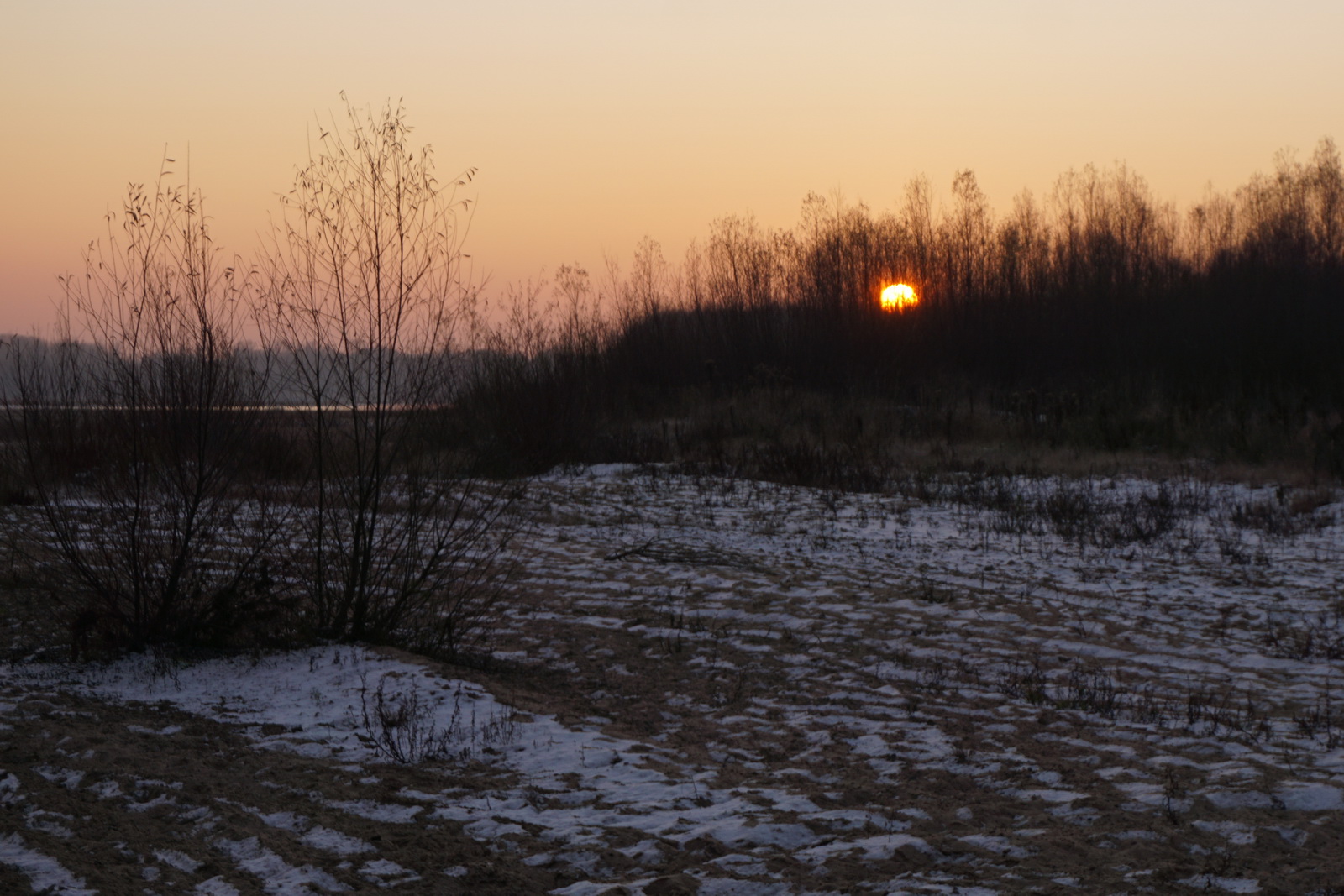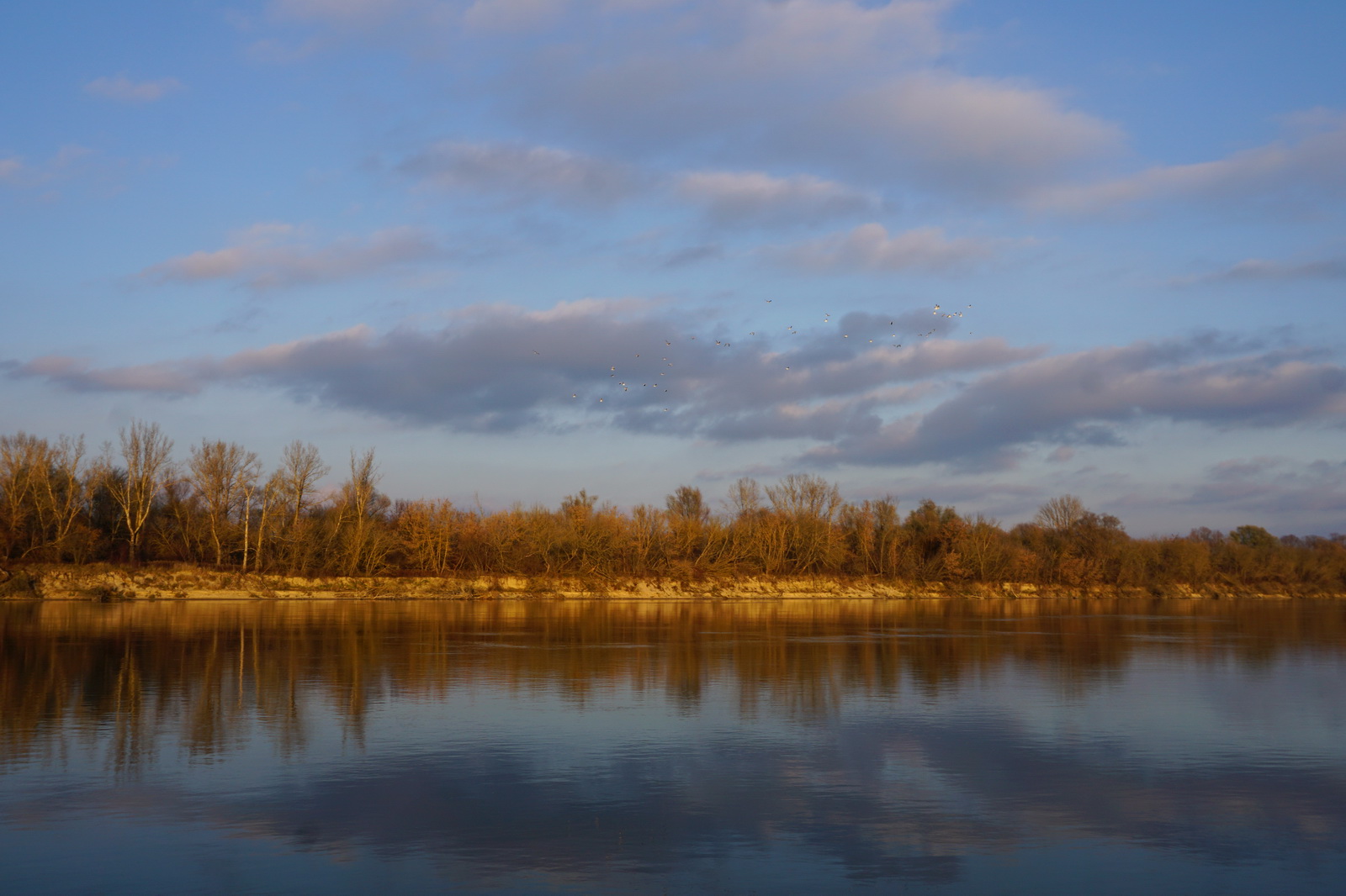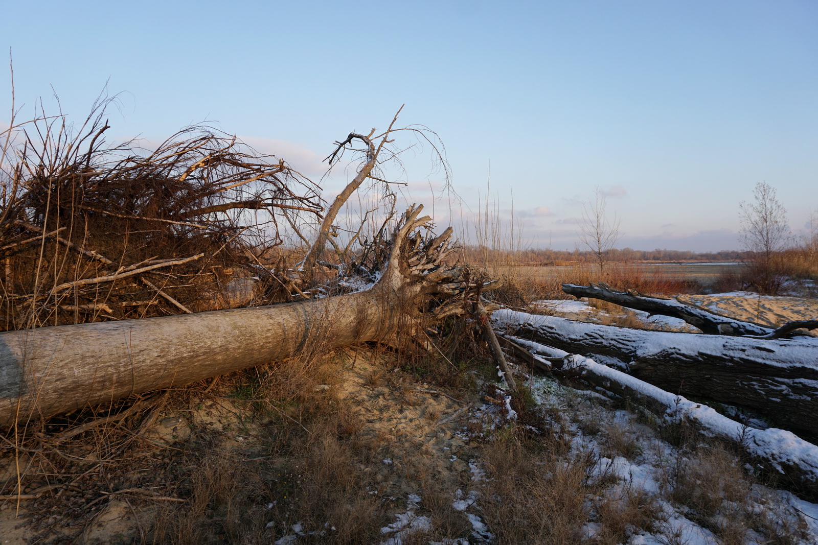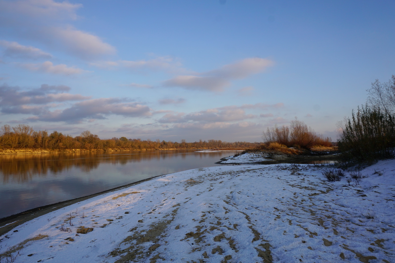 Kilka tygodni temu ustaliliśmy z Marcinem, iż mamy do obgadania kilka tematów i że w zasadzie można by to połączyć z jakimś noclegiem w terenie. Termin naszego biwaku zbiegł się w czasie z nagłym ochłodzeniem, ale ujemna temperatura nie była w stanie ostudzić naszych rozgorączkowanych głów. Kiedy przyczłapaliśmy nad Wisłę objuczeni garbami plecaków, nasze cienie były już długie, a nisko zawieszone słońce krasiło światłem jej przeciwległy brzeg. Nad ospale płynącą wodą od czasu do czasu przewalały się stada mew, zaś w tle chropawo nawoływały się kruki. Szybko ubywało dnia, więc niezwłocznie zabraliśmy się za rozbijanie namiotu i szykowanie ogniska. Nadrzeczne połacie piasku nocą oprószył śnieg. Wbijając śledzie w zmrożone podłoże, Marcin żartował, że to najlepszy moment na biwakowanie, ponieważ z pewnością nie będzie komarów 🙂 Ogień zapłonął na dobre prawie w tej samej chwili, kiedy na niebie dostrzegliśmy Jowisza. Podczas, gdy mój druh bawił się w „ogniskowego”, ja włóczyłem się po okolicy rozświetlając mrok lampą naftową. Potem, wlewając w siebie kolejne kubki kawy, ćwiczyliśmy się w sztuce „nicnierobienia”. Niedługo przed północą – zziębnięci i solidnie przywędzeni dymem – wbiliśmy się w śpiwory. Stłumione głosy przelatujących gęsi przypomniały mi naszą wyprawę na Svalbard (2017 rok), gdzie także dostawaliśmy w skórę na własne życzenie. Tam jednak było jasno przez całą dobę i trzeba było wypatrywać białych niedźwiedzi, mając u boku hitlerowski karabin. Teraz, starając się zasnąć, wsłuchiwałem się w odgłosy nocy. Moja Rzeka była tuż obok – zimna, spokojna i dzika, a generał mróz, nie pytając nikogo o zgodę, brał we władanie piaszczysty świat…