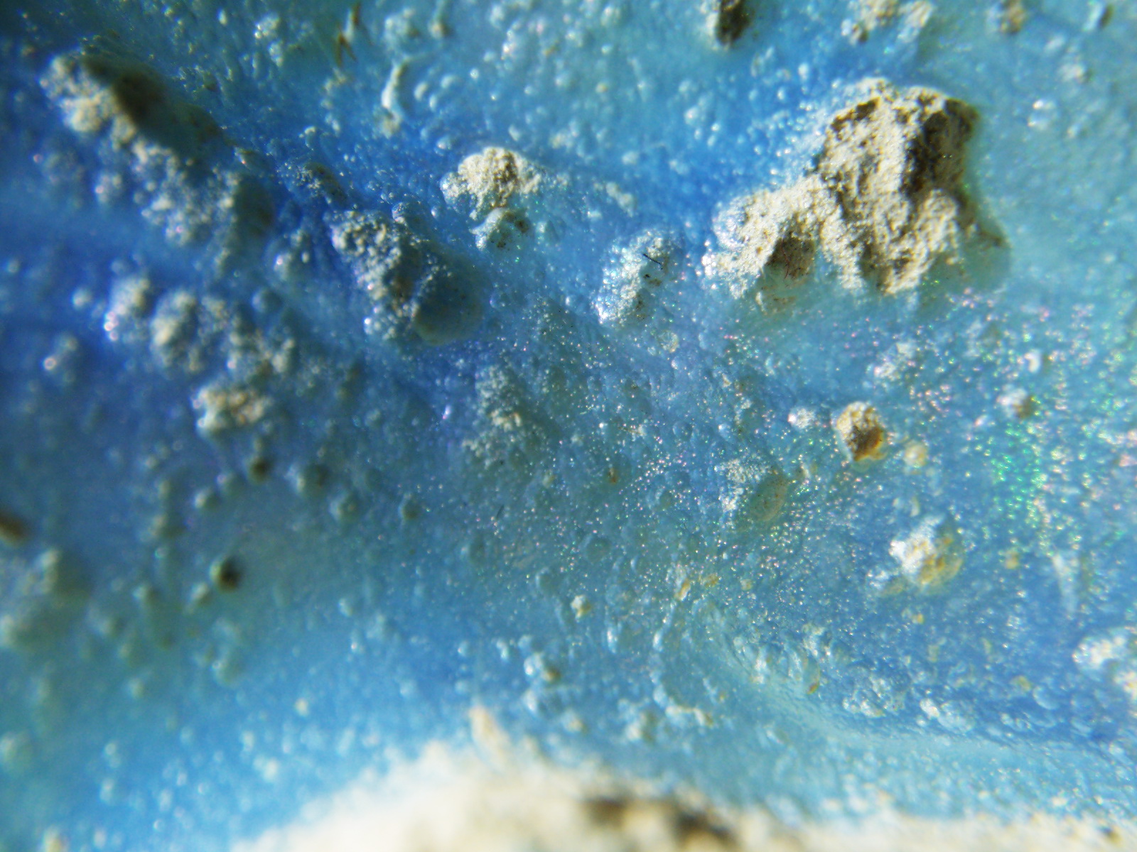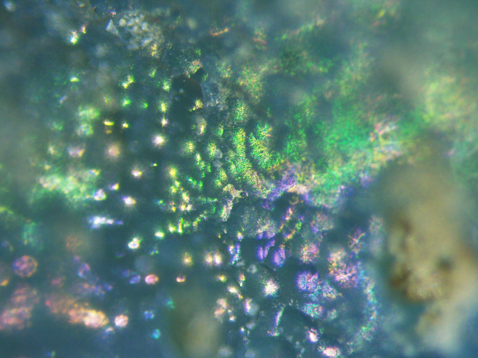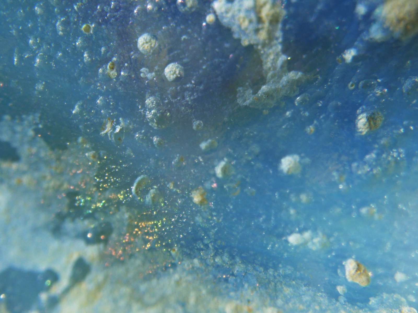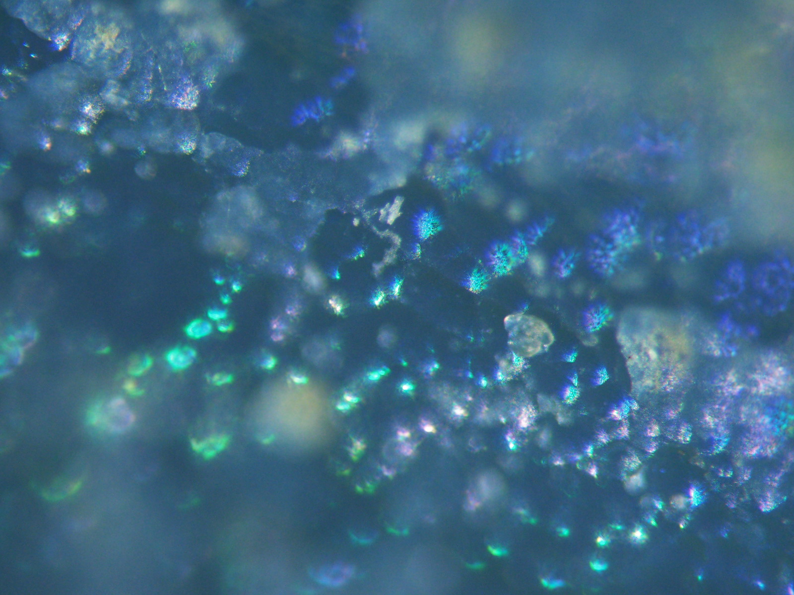 Co ciekawe, znaleziona przeze mnie szklana osobliwość może stać się jeszcze bardziej interesująca. Wystarczy obejrzeć ją w skali „mikro”, wzlatując na skrzydłach wyobraźni. W zbliżeniach jej powierzchni można doszukać się różnych ciekawych rzeczy. Szafirowe góry? Atole wysp na lazurowym morzu? Rozsypane klejnoty? Wielobarwna zorza? Kosmiczne skały? Proszę bardzo! Przeglądając poniższą galerię, możecie sprawdzić to sami…