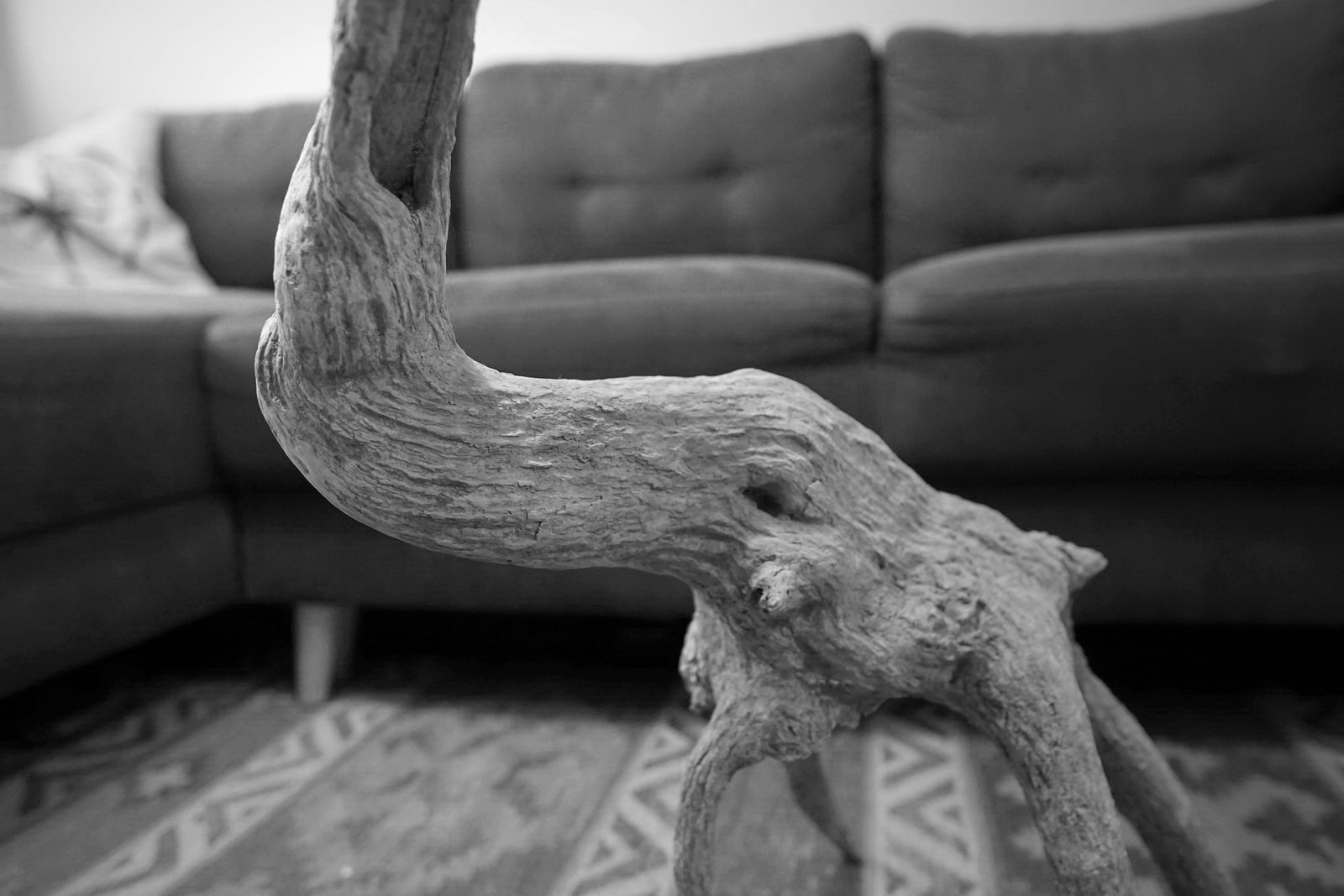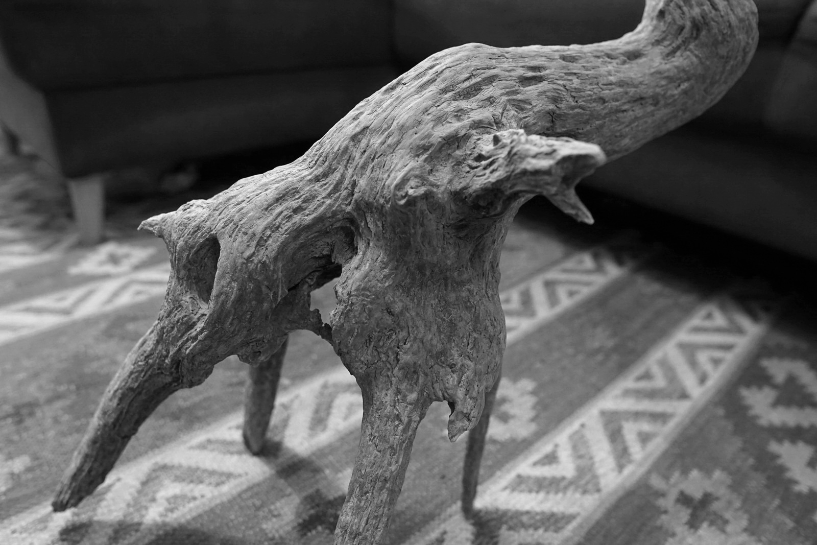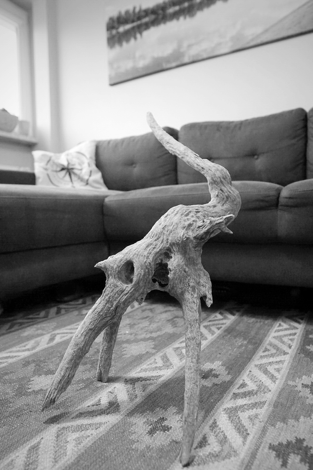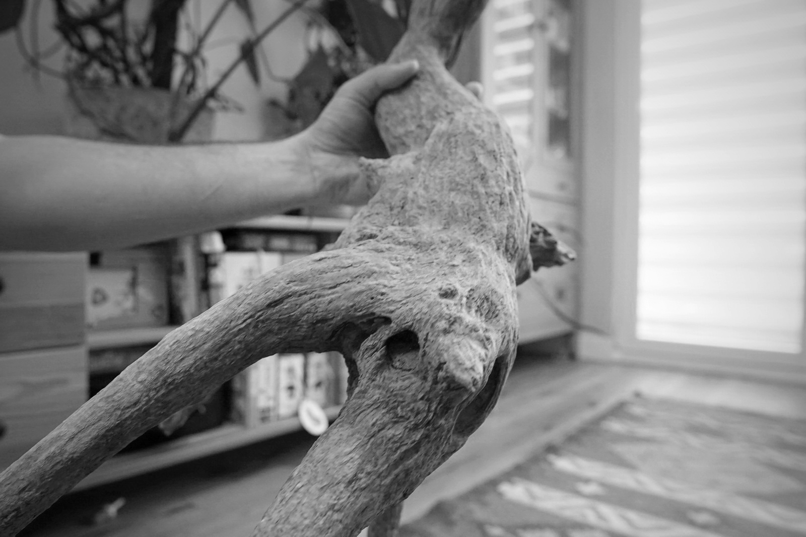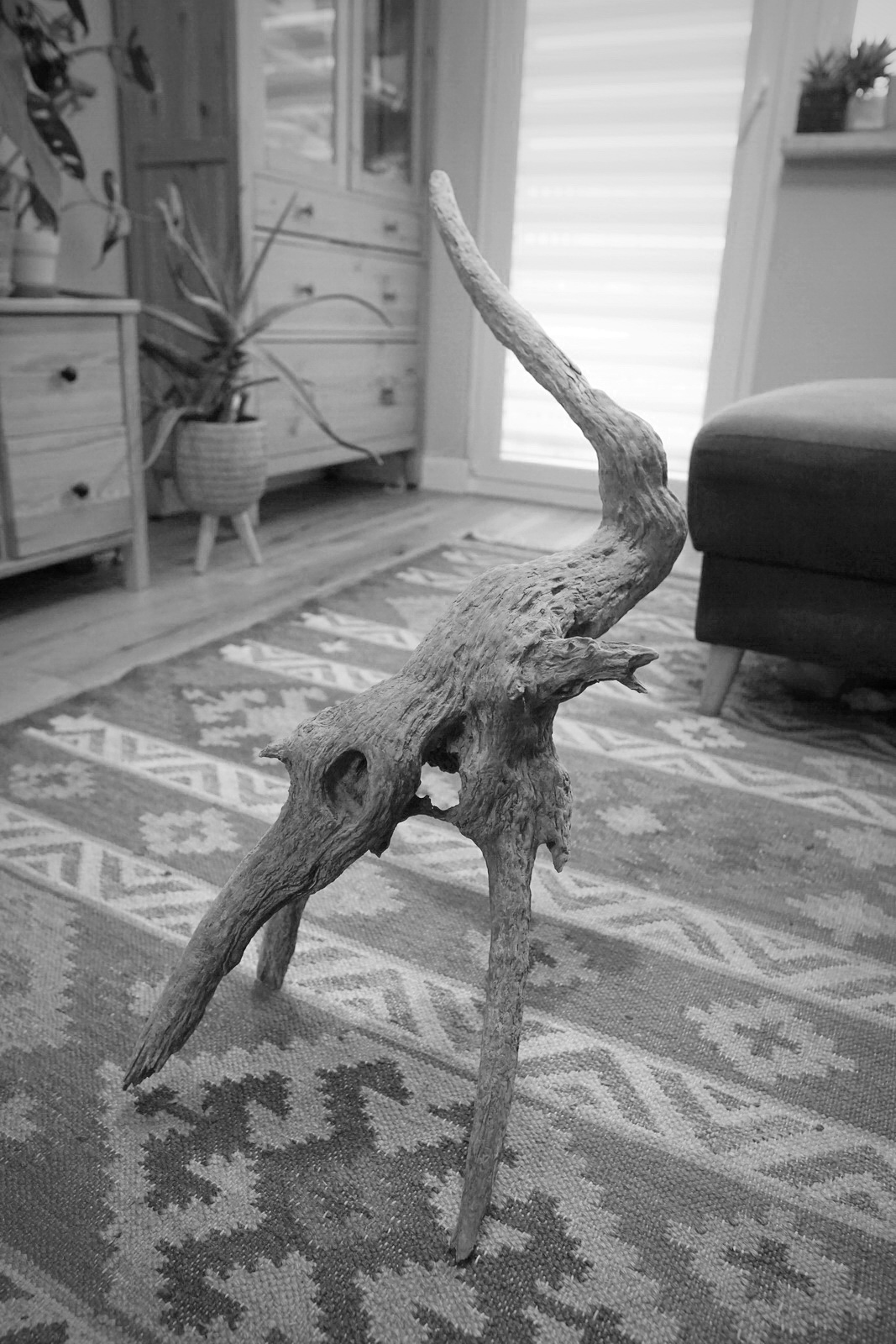 Zdarza się, że rodzinne plażowanie nad Wisłą prowadzi do wejścia w posiadanie niebanalnej rzeźby. Tak było m. in. jakieś dwa i pół roku temu, kiedy znalazłem cudacznie wyglądającą pozostałość jakiegoś zatopionego drzewka. Gdy wróciliśmy do domu, Artur odłamał jeden z korzeni i tak – praktycznie zerowym nakładem sił – powstało coś w rodzaju astro-dinozaura (kreatura ma nawet dziurę w zadku 🙂 ). Na poniższych zdjęciach możecie zobaczyć, jak to dzieło Rzeki i Artura prezentuje się dzisiaj. „Driftwood” z Wisły? Lubię to!