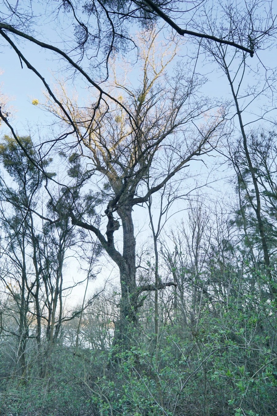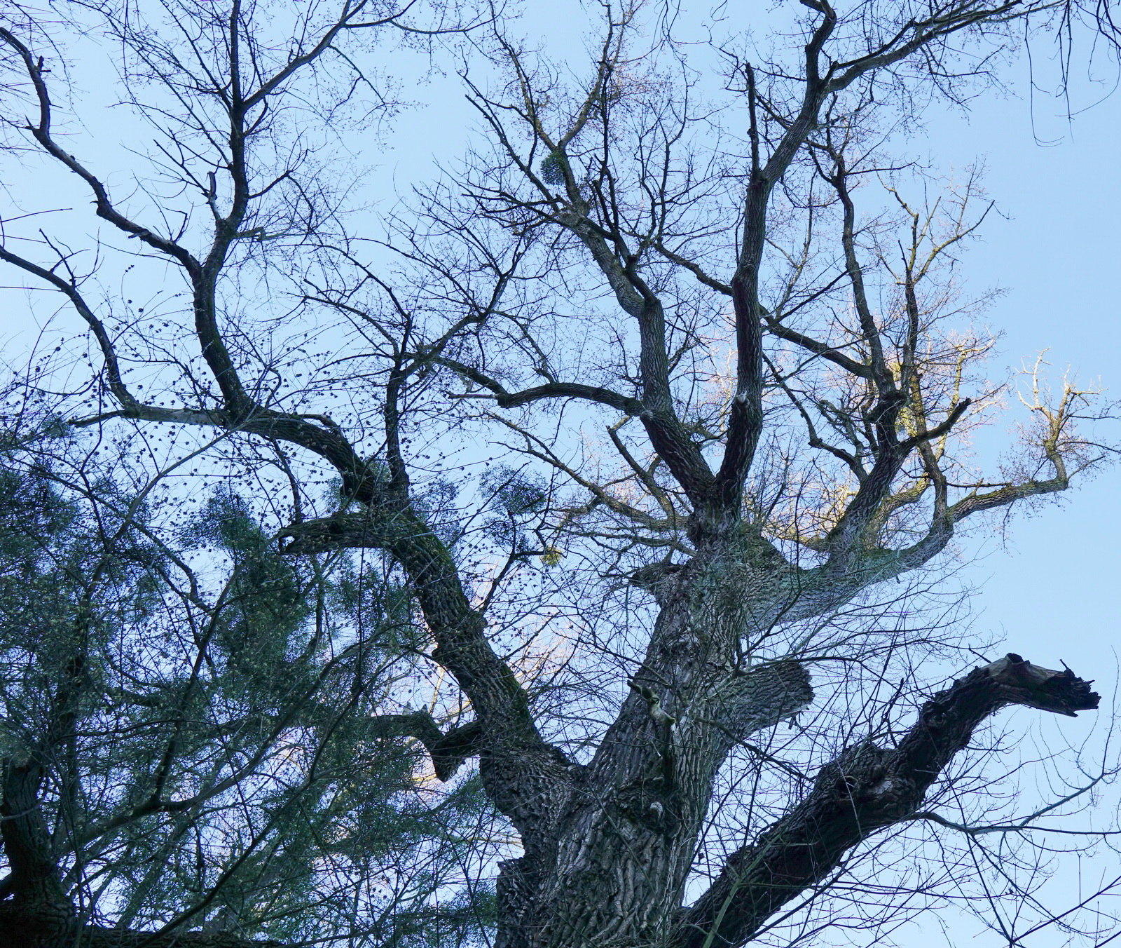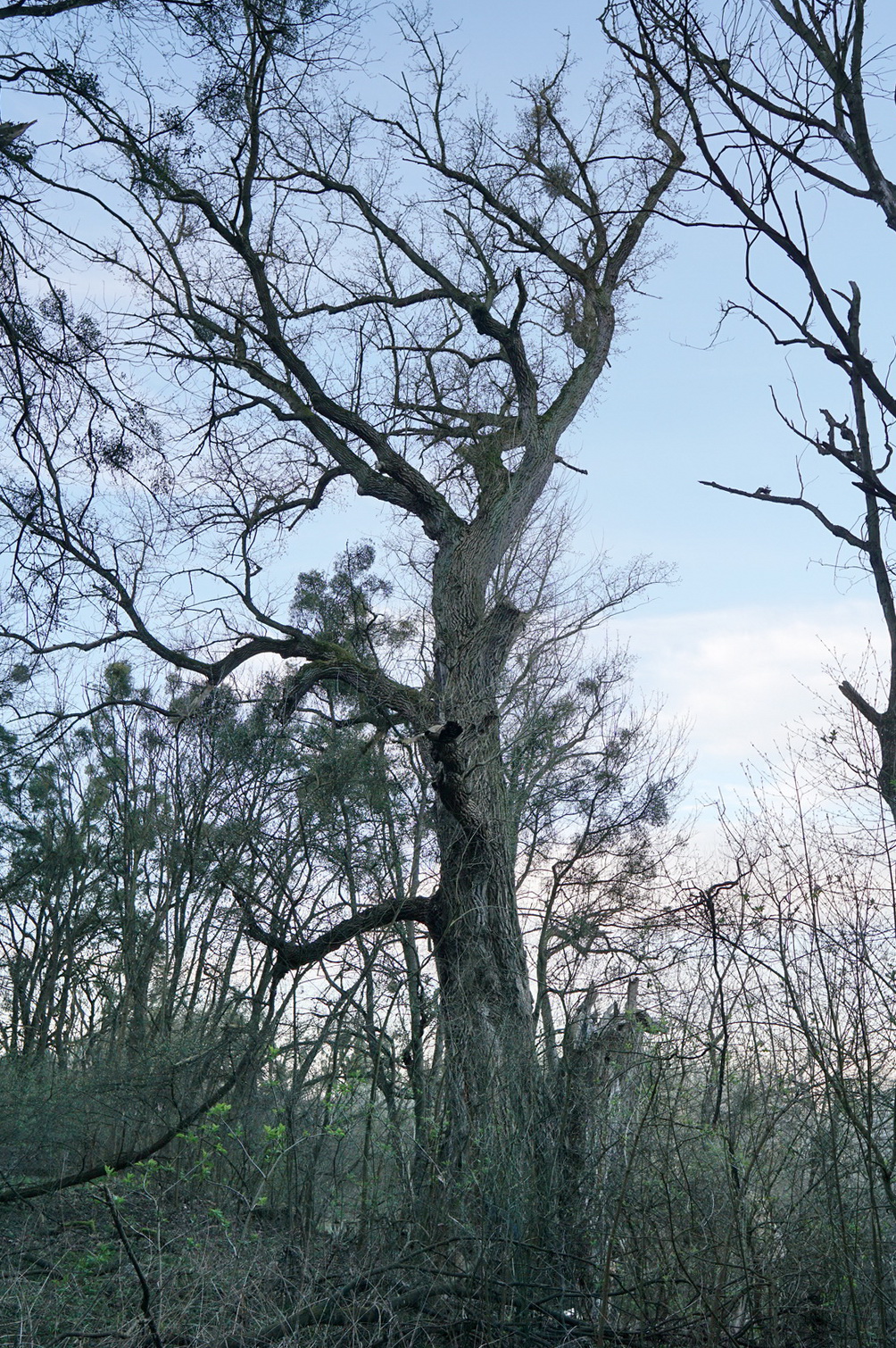 Tymczasem, dwa dni po tym, jak olbrzymkę z miasta ułanów uhonorowano pomnikowym statusem, pojechałem ją odwiedzić. Tym razem nie byłem sam – na krótką wizytę u topolowej prababki zabrałem Marcina. Idąc ku niej pochyłym tarasem biegnącym wzdłuż zbocza Kępy Fortecznej, byliśmy świadkami przelotu grupy ponad dwudziestu kruków. Gdy dotarliśmy na miejsce, grał werbel dzięcioła, a promienie wschodzącego słońca muskały wciąż bezlistną koronę „Horpyny„, podkreślając czerwonawy kolor kwiatostanów zdobiących najwyższe gałęzie. Brak liści i nieporównywalnie lepsza niż ostatnio widoczność sylwetki drzewa pozwoliły mi na wykonanie dokładniejszego pomiaru jego wysokości (36,7 m; średnia wartość z kilku pomiarów). W koronie można było dostrzec pojedyncze pęczki jemioły (grupa klonów, będących jej sąsiadami jest nią bardzo mocno porażona) i trochę suchodrzewu. Na murszejącej korze mocarnego pnia wypatrzyłem zgrupowanie niemrawych mrówek oraz kilka zaspanych pająków. Podstawę drzewa zdobiła natomiast kępka kwitnących fiołków, a niedaleko rosło trochę owocników kustrzębki pęcherzykowatej. Po fragmentach rozkładających się konarów, licznie rozesłanych na żyznej ziemi, harcowały myszy. Nie spiesząc się nigdzie, piliśmy gorącą kawę. Pomiędzy gęstwą okolicznych drzew i krzewów wciąż było widać pięknie rozlaną Wisłę, zza której co jakiś czas dobiegały fanfary żurawi. Czuć było jednak, że nad Polskę cały czas napływa nienaturalnie ciepłe, jak na porę roku powietrze oraz, że już za moment, „zieleń” – gwałtownym zrywem – przesłoni i zdominuje cały tutejszy świat…