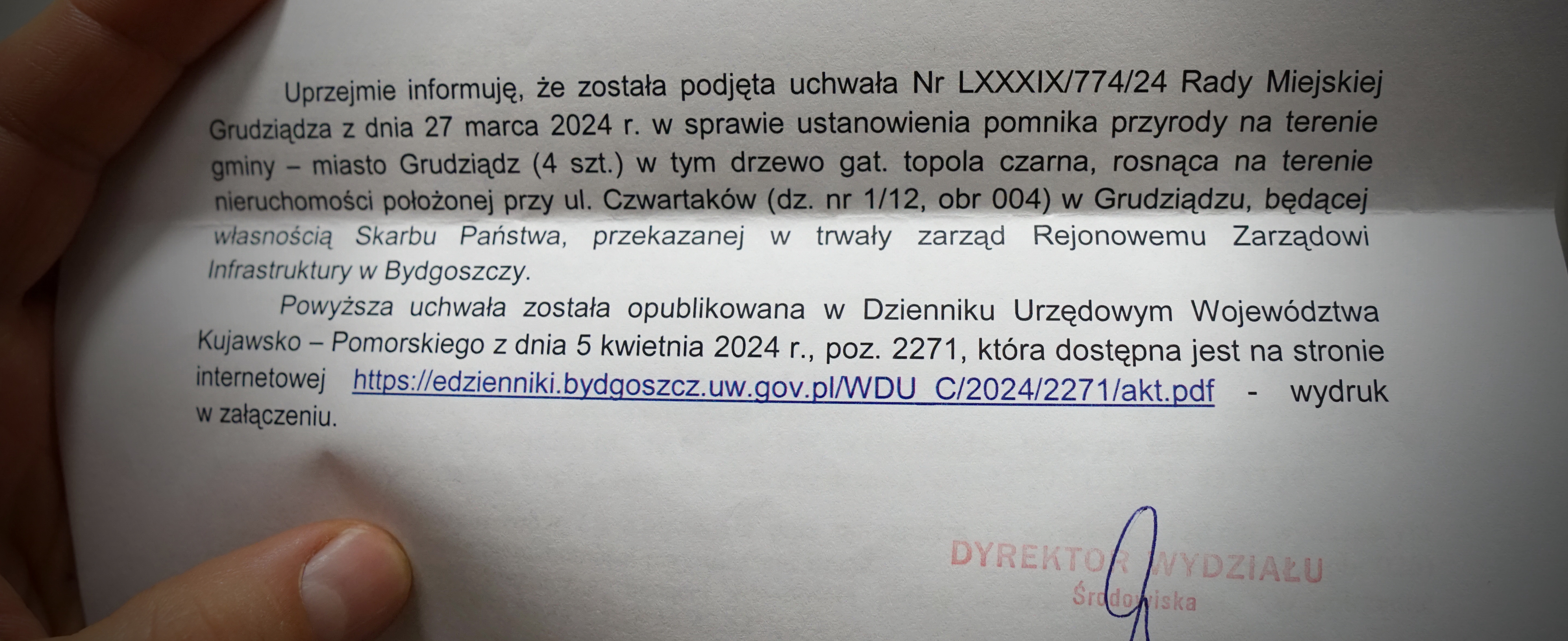 Fragment urzędowego pisma, którym zostałem poinformowany o podjęciu uchwały w sprawie ustanowienia pomnika przyrody na terenie Grudziądza.