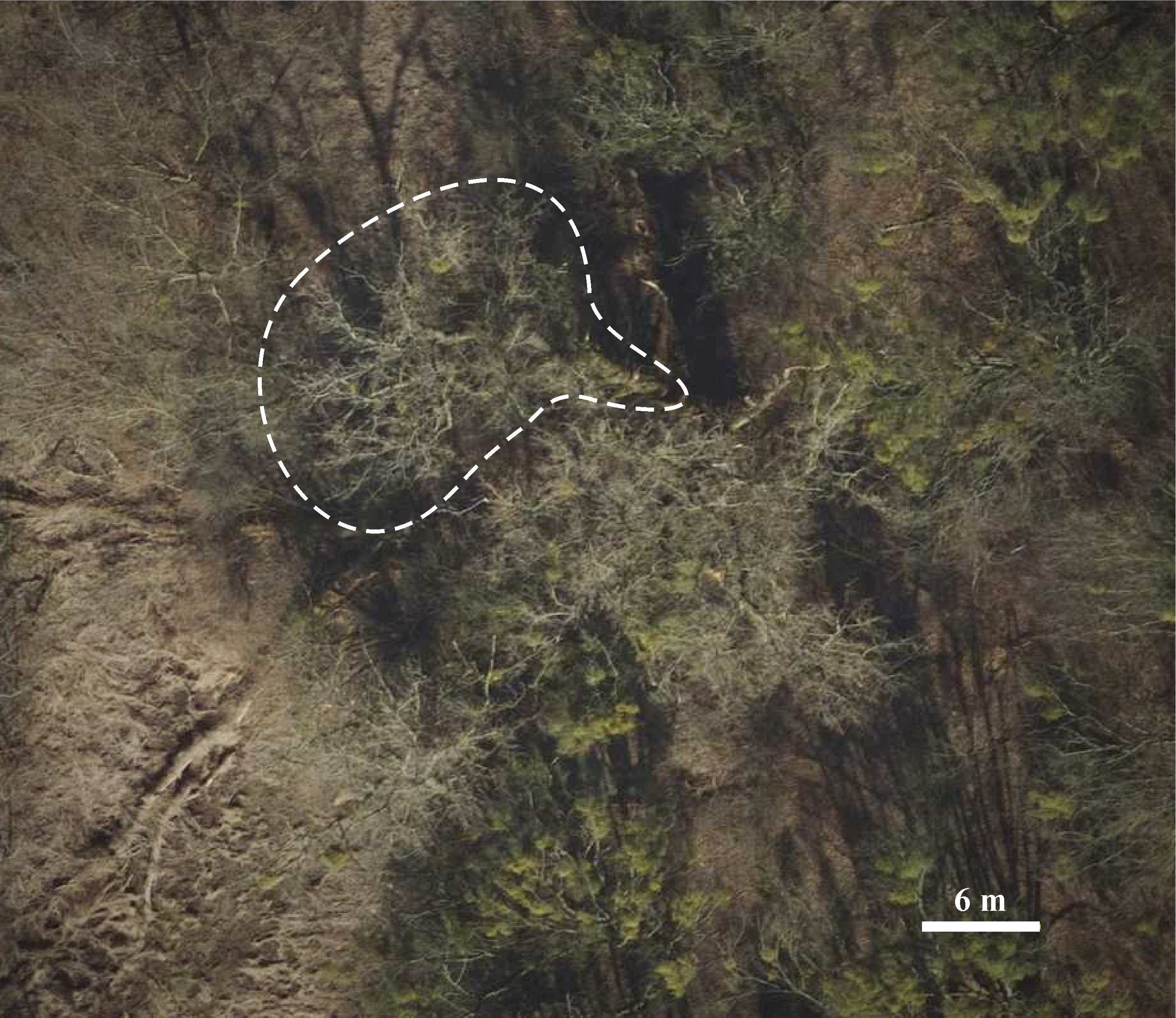 „Horpyna” sportretowana z powietrza (źródło – baza danych Geoportalu Krajowego [LINK]). Aktualnie, na skutek złamania się jednego z przewodników nie ma już około 40% korony widocznej na zdjęciu (zaznaczyłem ją przerywaną linią).