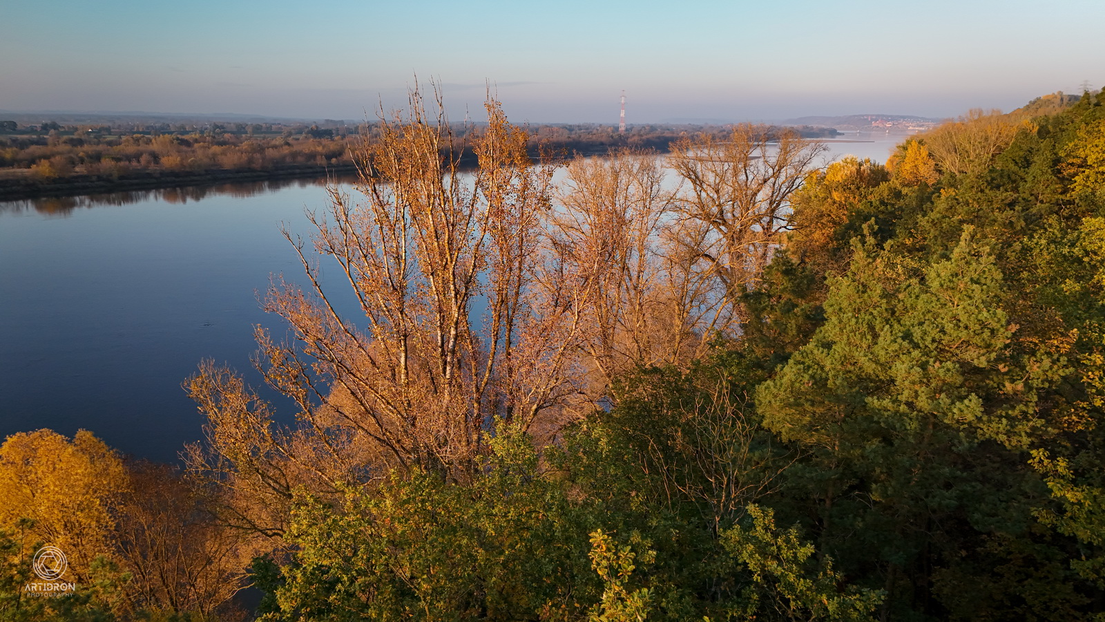 Wisła i kilka topól (w środku kadru) rosnących u podnóża jednej z nadwiślańskich polodowcowych wysoczyzn; zdjęcie autorstwa ARTIDRON Photography.