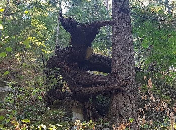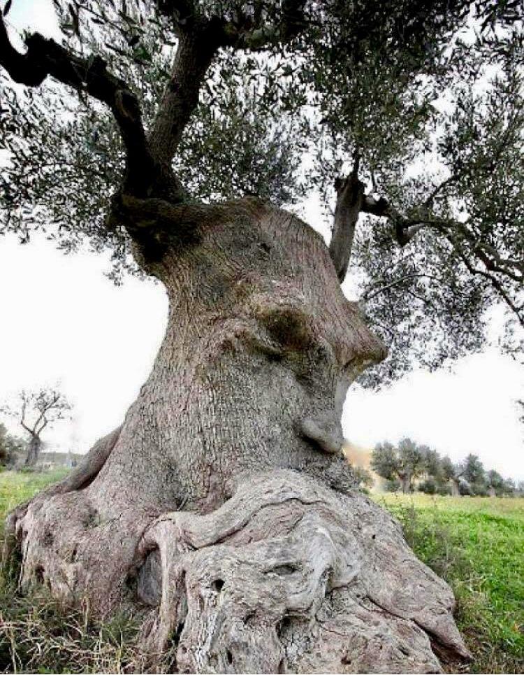 Przykłady pareidolii ze świata roślin: słynne „myślące” drzewo oliwne z włoskiej Apulli [źródło], przywiędły kwiat róży [źródło], „drzewny demon” [źródło] oraz uschnięte kwiaty wyżlinu [źródło].