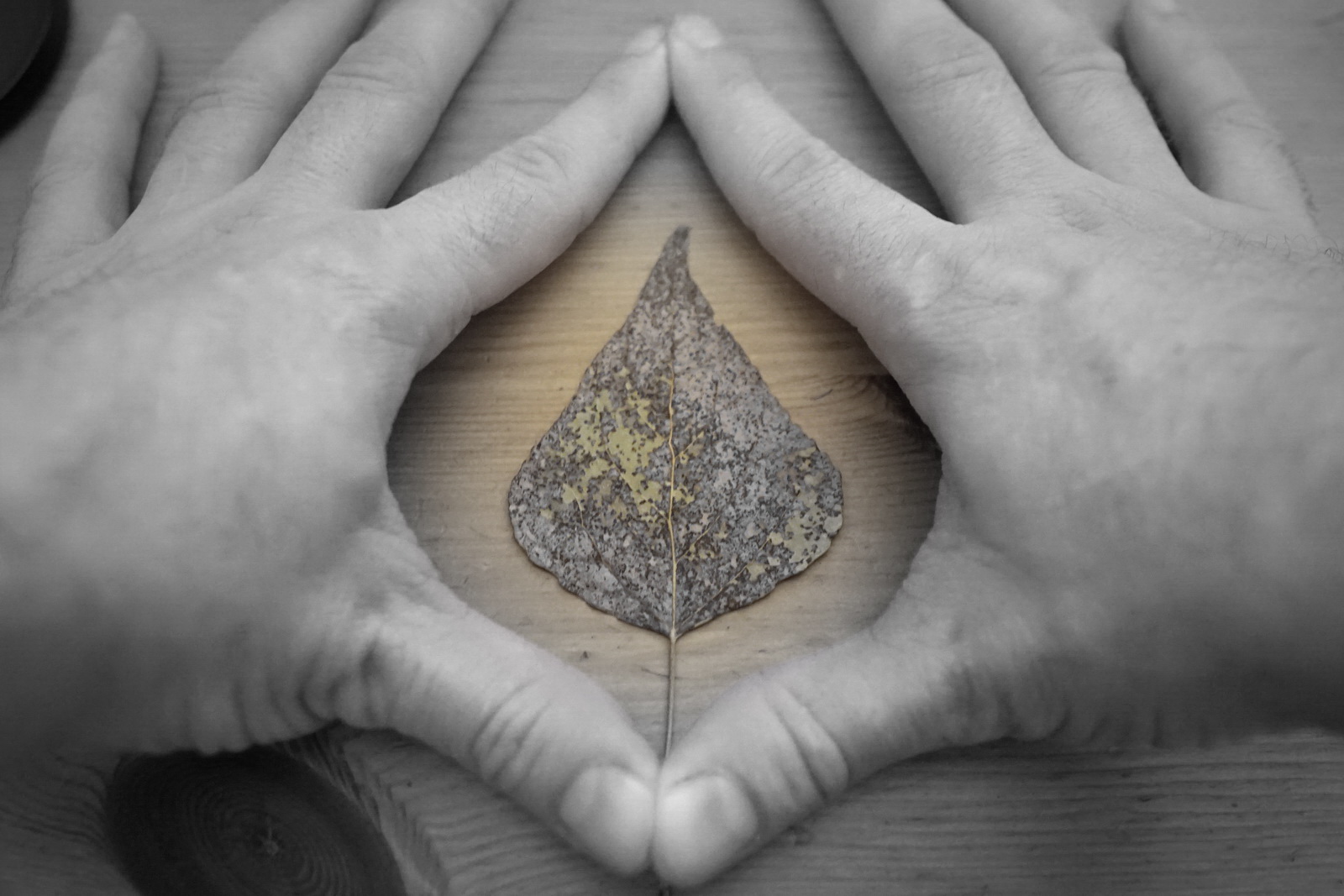 Dłonie ułożone w sposób odtwarzający romboidalny kształt liścia sokory.