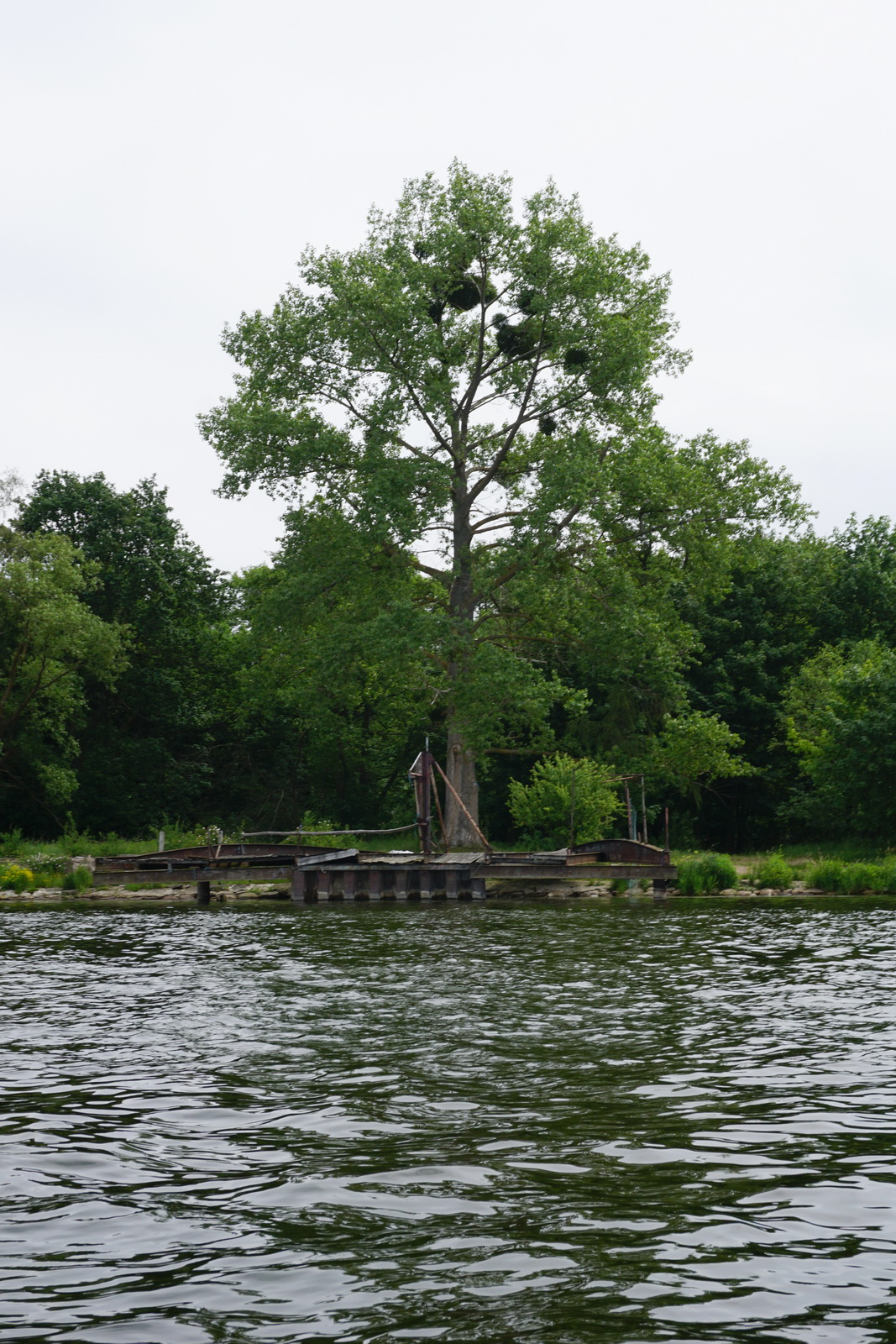 W przerwach między opadami dwukrotnie odwiedziłem ujście Wisły. W okolice Świbna i Mikoszewa ciągnie mnie nie tylko z powodu Rzeki, ptaków i fok. Nieco ponad półtora kilometra na północ od przeprawy promowej – na prawym brzegu, znaleźć można też coś innego, ale również wartego uwagi. Maszerując ścieżką biegnącą równolegle do nabrzeża, w ciągu około trzydziestu minut można dotrzeć do pozostałości pomostu cumowniczego. Tuż obok stoją klockowaty bunkier oraz górująca nad otoczeniem stara topola kanadyjska (Populus × canadensis ‘Robusta’).