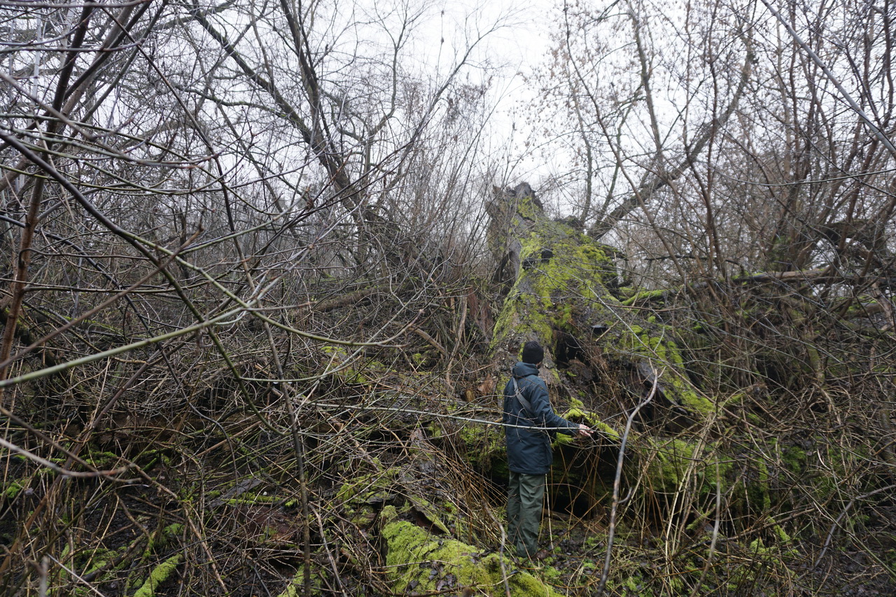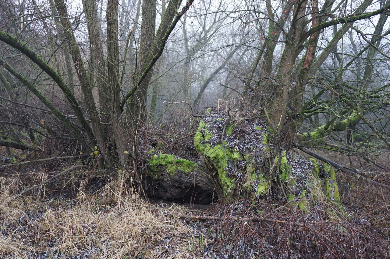 Dzisiaj nie ma tu nikogo poza nami, ale nie sposób nie zauważyć „pamiątek” pozostawionych przez innych ludzi. Gdzieniegdzie walają się śmieci – butelki po wódce, lodówka z wyrwanymi drzwiami, puszki po konserwach, foliowe torby. Być może niektóre z nich zostały przyniesione przez wodę, jednak tego nie wiemy. W każdym razie jest to smutny widok. Odpoczywamy siedząc na próchniejącej kłodzie klonu jesionolistnego. Wokół nas kolczaste pędy jeżyny. W koronach drzew buszują sikory i czyże. Wcześniej widzieliśmy też samotnego kruka, który, lecąc w stronę Rzeki, niósł coś w dziobie, a Marcinowi uciekła spod nóg jakaś spłoszona mysz. Nasze ubrania są ubłocone i mokre, ale to nie przeszkadza. Rozmawiamy o swoich sprawach, popijając kawę z termosu. Jest dobrze – po prostu cieszymy się chwilą.